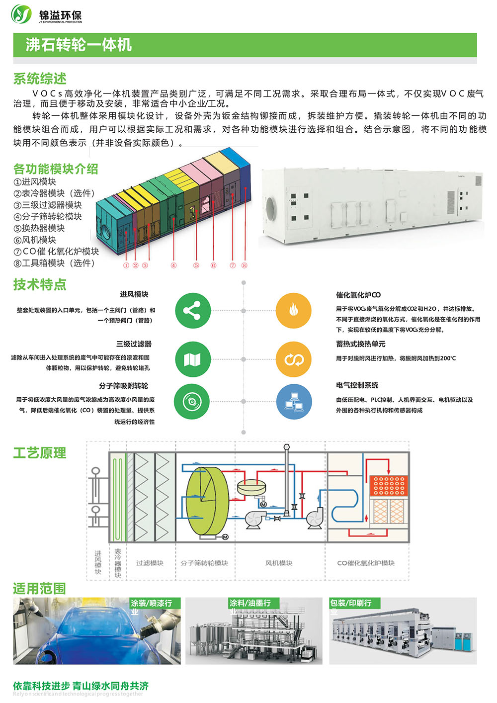 VOCs高效净化一体机装置产品类别广泛,可满足不同工况需求。采取合理布局一体式,不仅实现VOC废气治理,而且便于移动及安装,非常适合中小企业/工况。 转轮一体机整体采用模块化设计,设备外壳为钣金结构铆接而成,拆装维护方便。装转轮一体机由不同的功能模块组合而成,用户可以根据实际工况和需求,对各种功能模块进行选择和组合。结合示意图,将不同的功能模 块用不同颜色表示(并非设备实际颜色)